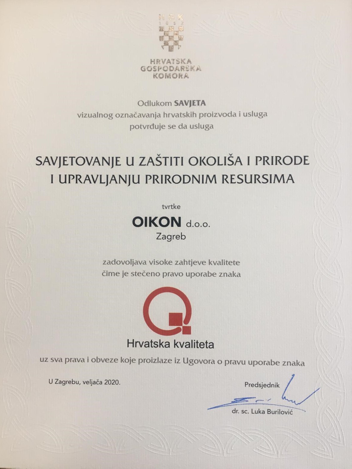 6. ožujka 2020. – S ponosom objavljujemo da nam je Hrvatska gospodarska komora dodijelila pravo uporabe znaka “Hrvatska kvaliteta” za stručne i savjetodavne poslove u zaštiti okoliša i prirode te upravljanju prirodnim resursima .